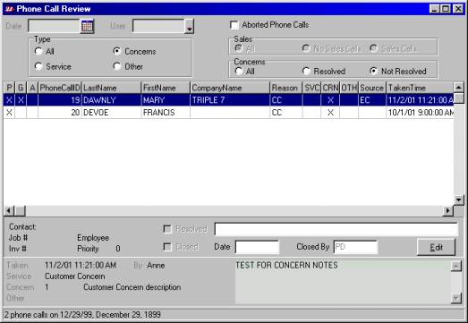 The Phone Call report also has a Concern portion that shows the resolution (if any), as well as the close date and who closed the concern.