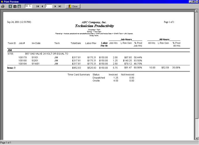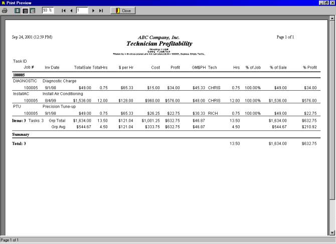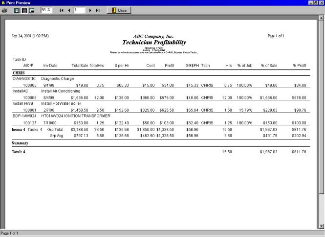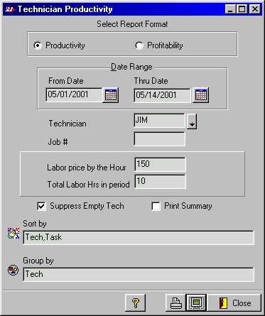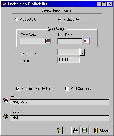The Technician Profitability option is designed to give you an idea of how profitable your technicians are. There are many ways to run and group this report, but the two basic ways are grouped by either Tech or Job.