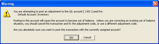 Unless the transaction is necessary to correct an out of balance situation, you should Cancel and select another adjustment code / G/L account.