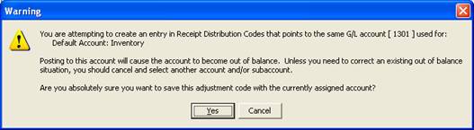 Warning messages have been added to the software when setting up adjustment codes when the general ledger account assigned will affect an account that must reconcile with another module in the software. This extra validation will help ensure that general ledger is kept in balance with the various source modules. While adjustments to these accounts may sometimes necessary for correcting problems, they should not be made under normal circumstances.