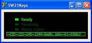 When SW21Keys launches, it automatically goes into ‘ready’ mode which means it is ready to accept macros. By default, is it correctly configured to target the SuccessWare21 application for sending windows messages. If you mouse over the upper right hand corner of keys, you will find two labels that become visible; ‘CID’ and ‘CIDG’. You can click these labels to generate a sample macro. The macro will be generated and sent to SW21Keys is the exact same manner as if a third party application had sent it.