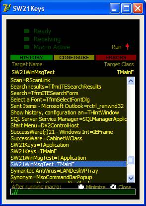 To test SW21Keys without anSuccessWare21 launch both SW21Keys.exe and SW21WinMsgTest.exe. Then configure SW21Keys to target the SW21WinMsgTest in place of SuccessWare21 as follows: