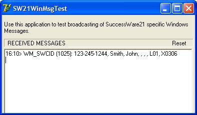 Development testing can be achieved without an installation of SuccessWare21. This is accomplished by using SW21WinMsgTest in place of SuccessWare21. This test utility will act like SuccessWare21 and respond to the same Caller ID Windows Message by displaying the information from the message.