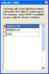 · Click the DNIS button. This will open the Caller ID / DNIS Window and here you can enter the phone number(s) for this company that you wish to have a screen pop for.