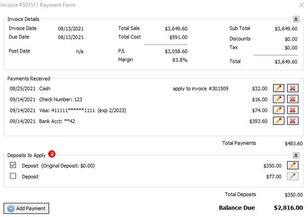 On the Invoice Payment Form, if the customer has any unposted deposits, a red badge will appear next to the deposit list indicating the number of unposted deposits. Click this badge to open a form where deposits for that account can be posted.