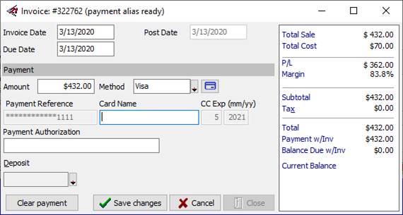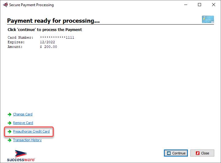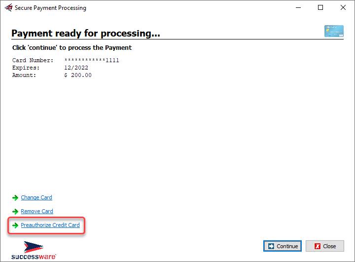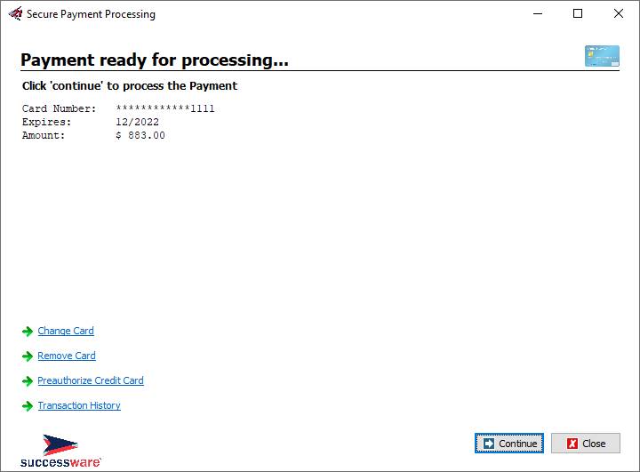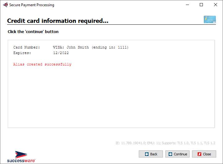 8. Click Continue and then Close to close the Successware Payments form. 9. The “alias” is not displayed, but instead the masked credit card number will appear in the PAYREF field below the Payment Method.