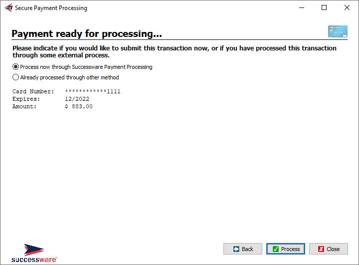 8. Choose an option for processing. a. If the payment should be processed immediately through Successware Payments, select “Process now” and click Process. The payment will be processed and the result of Approved or Declined will be displayed. b. If the payment has already been processed through Successware Payments outside of Successware (such as through Successware Mobile or the Successware Pay), select “Already processed” and click Done. This will record the payment in Successware but will NOT process through Successware Payments.