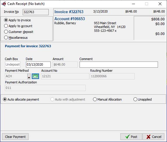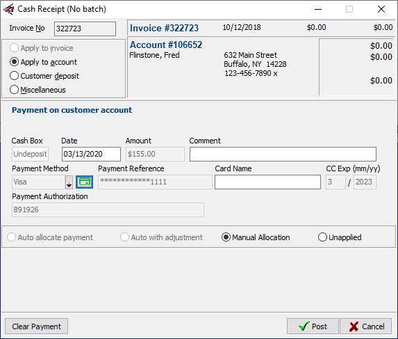 10.The masked credit card number along with the expiration date and payment authorization appear on the CASH RECEIPT FORM. Click Post to post the payment to the customer’s account.