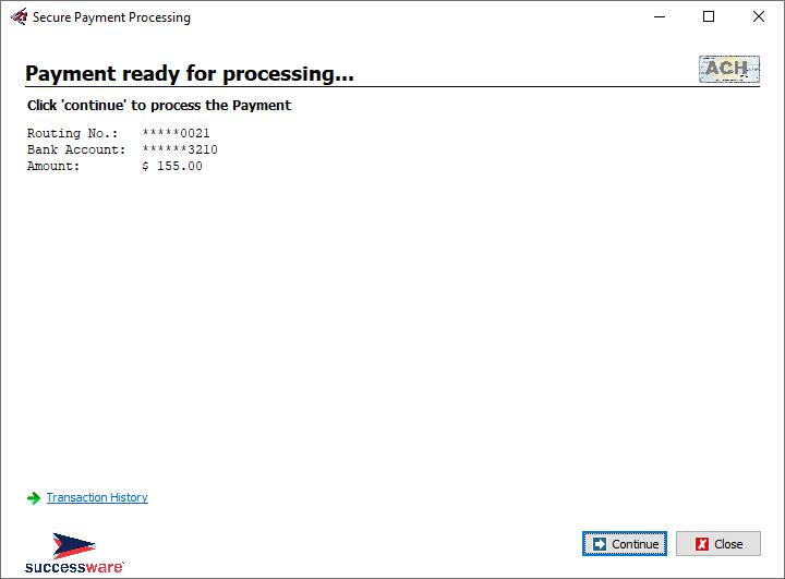 5. Click the Continue button to open to connect to the Successware Payments Service.