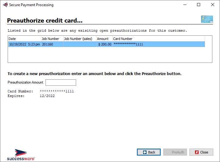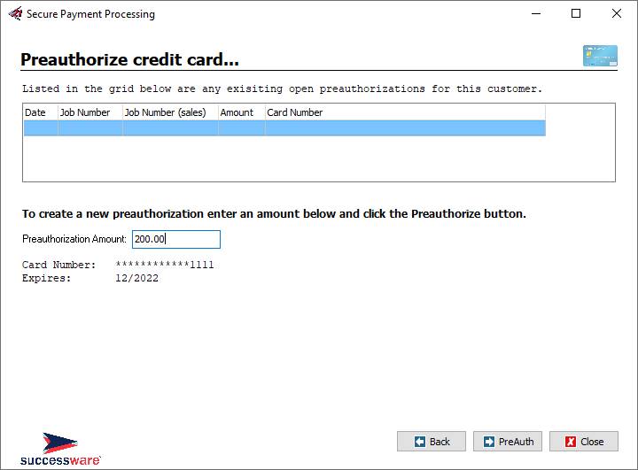 PROCESSING form that you use to process a payment. Pre-Authorizations can be created from: · Billing Account Detail screen (F3) · The Job Form · The Apply Payment window in the Invoice Form · Job Summary Form · Sales Summary Form · The Billings tab in the Project form Each of these forms contains an area to record payment information. To