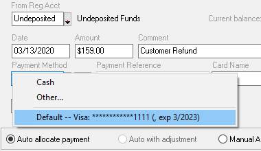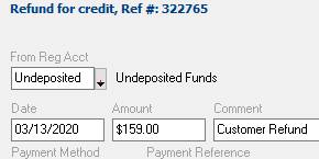 the BILLING ACCOUNT HISTORY (F4) screen for the customer you wish to refund. 2. Be sure you are selected on a line item other than an invoice or credit. Click the Refund button. 3. You will be taken to Customer Refund Screen. In order to process a Credit Card Refund, change the From Register Account to your Undeposited Funds Account. 4. Enter the Date and Amount of the refund. 5. Enter a Comment indicating the reason for the refund. 6. Select the Payment Method. If the Credit Card you are refunding has been processed in the past, it will appear in the list. Select it. If the Credit Card is not in the list, select Other and then the type of card you are refunding. 7. Click
