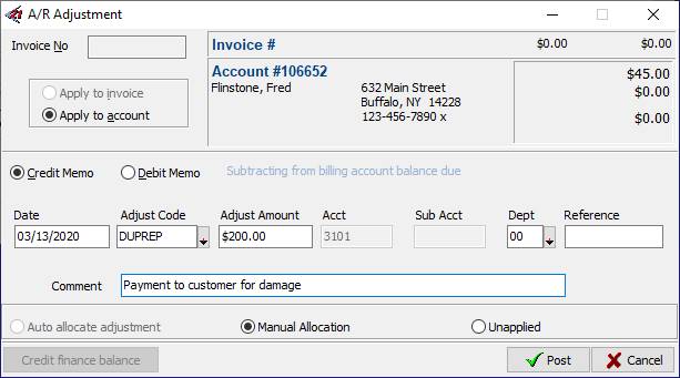 13.This will record the refund on the customer account, but it also creates what appears to be a balance due. We will use a credit adjustment allocated against the Refund to eliminate the effect of the customer’s balance due. 14.Highlight the refund in the customer’s Billing Account and click the Adjust button. 15.Be sure that you are creating a Credit Adjustment in the AR ADJUSTMENT form. 16.Choose the ADJUSTMENT CODE that represents the reason for the refund given to the customer. This will determine the GL account that will be posted against. 17.Enter the AMOUNT of the Adjustment 18.Choose the DEPARTMENT that will be incurring the “expense” of the refund. 19.In the COMMENT field enter a description of the reason for the adjustment. 20.Be sure MANUAL ALLOCATION is selected