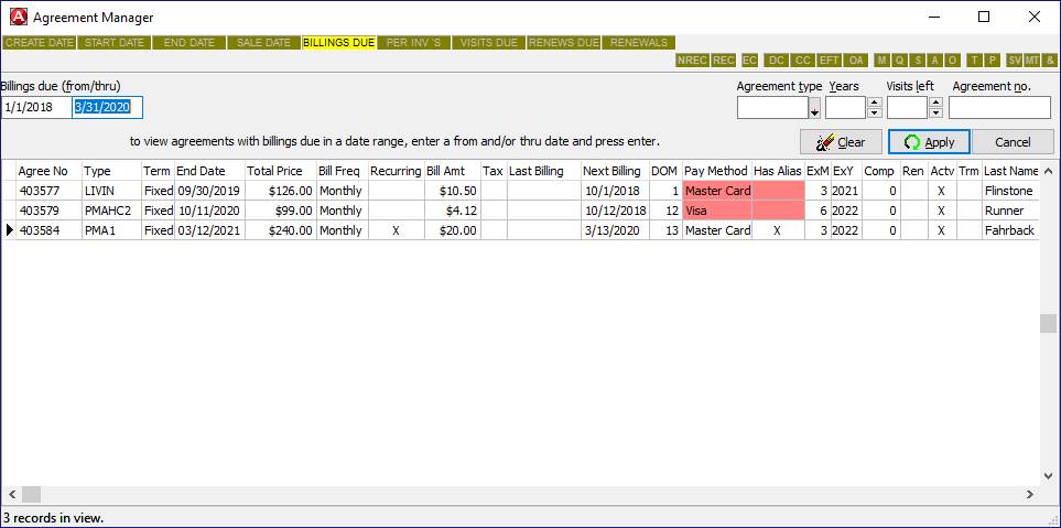 the AGREEMENT MANAGER, select the BILLINGS DUE search indicator. 2. Enter the date range for which you want to find billings due, as well as any other search criteria you desire. 3. Press Enter. The AGREEMENT MANAGER will display a list of all billings due for the specified time frame.