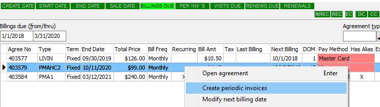 4. Any of the listed Billing Due that show a red highlighted Payment Method do not have a valid Alias assigned from Successware Payments. In order to process these payments, you must recapture the credit card information. To do so: a. Highlight the row and press F7 to open the agreement. b. Right click and select Edit Payment Method c. Click the Payment Processing button, add the customer’s credit card information and click Submit to generate an Alias. d. Click Continue. e. If you want to set the agreement to process recurring payments automatically click Enable, if not, just close the form, agreement and customer. 5. Right-click on the list of Billings Due and select Create periodic invoices.