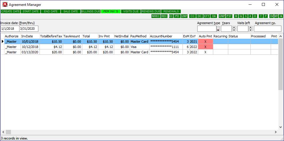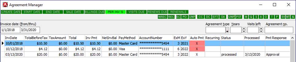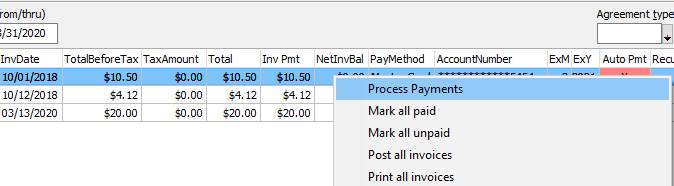 You have two options for processing those periodic billings: Schedule Recurring Billings- If you have set up Agreements with scheduled recurring billings through Successware Payments, you can create the periodic invoices and then reconcile them to a statement that you download from Successware Payments. The reconciliation statements will match the payments to the appropriate invoice and indicate whether it processed successfully. You can then batch post the invoices. Manually Process from Agreement Manager- If there are agreements that you want to process instead of them charging automatically, you can set the agreement up just like those that Auto Bill, but just do not do the Recurring Setup. You can then generate the periodic invoices in the Agreement Manager and then process the payments with a right click options. Once the payments are processed, each invoice will show the status of the payment and you can batch post the invoices. When Successware Payments is enabled, periodic agreement billings can be processed directly from the AGREEMENT MANAGER. Creating