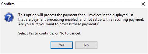 2. A confirmation window will appear to inform you that the invoices in the displayed list will be processed for payment. Only those invoices with a valid Successware Payments alias and ARE NOT marked Recurring will be processed for payment.
