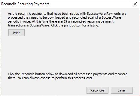 3. Click Reconcile in the window that opens and Successware will download all processed recurring payments from the processor and link them to the appropriate invoice.