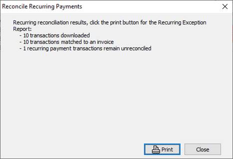 4. You will receive a notification with the results of the download. If there are items that you need to review such as unreconciled transaction you can choose Print to view the list, otherwise close the dialog.